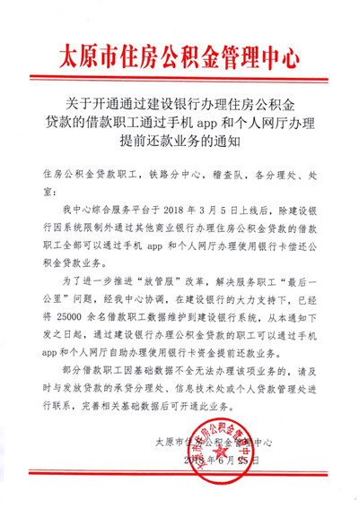 關(guān)于開(kāi)通通過(guò)建設(shè)銀行辦理住房公積金貸款提前還款業(yè)務(wù)的通知