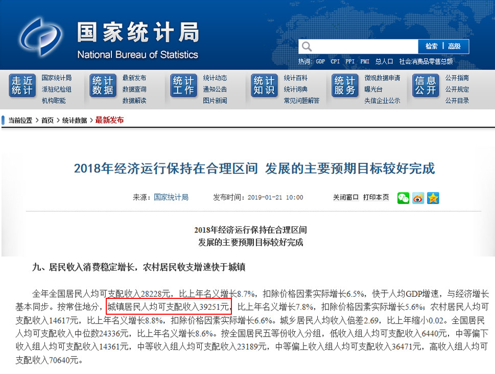 2019年1月21日上午10點,國家統(tǒng)計局召開國民經濟運行情況新聞發(fā)布會,公布了以下數據:2018年全年全國居民人均可支配收入28228元,2018年城鎮(zhèn)居民人均可支配收入39251元。