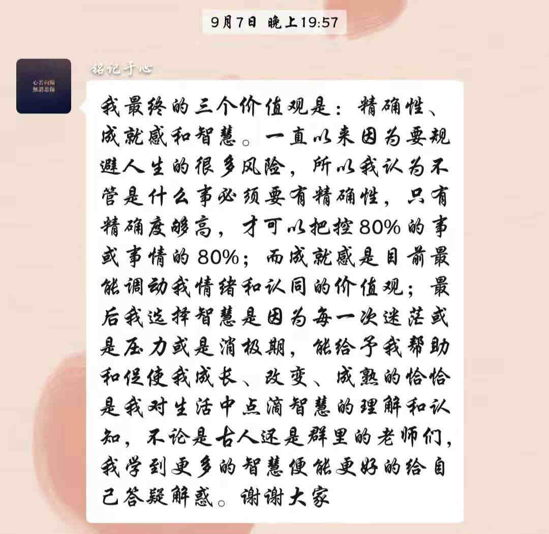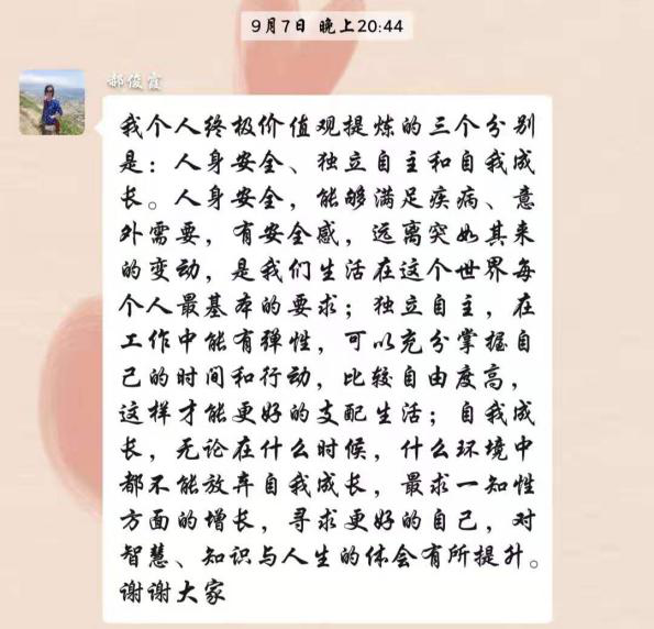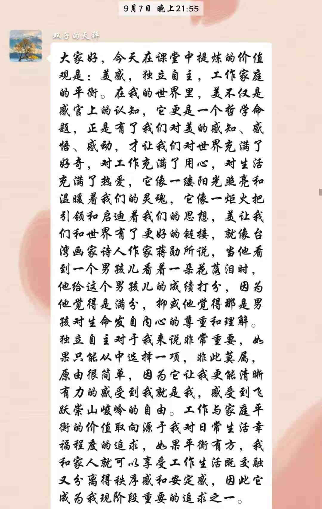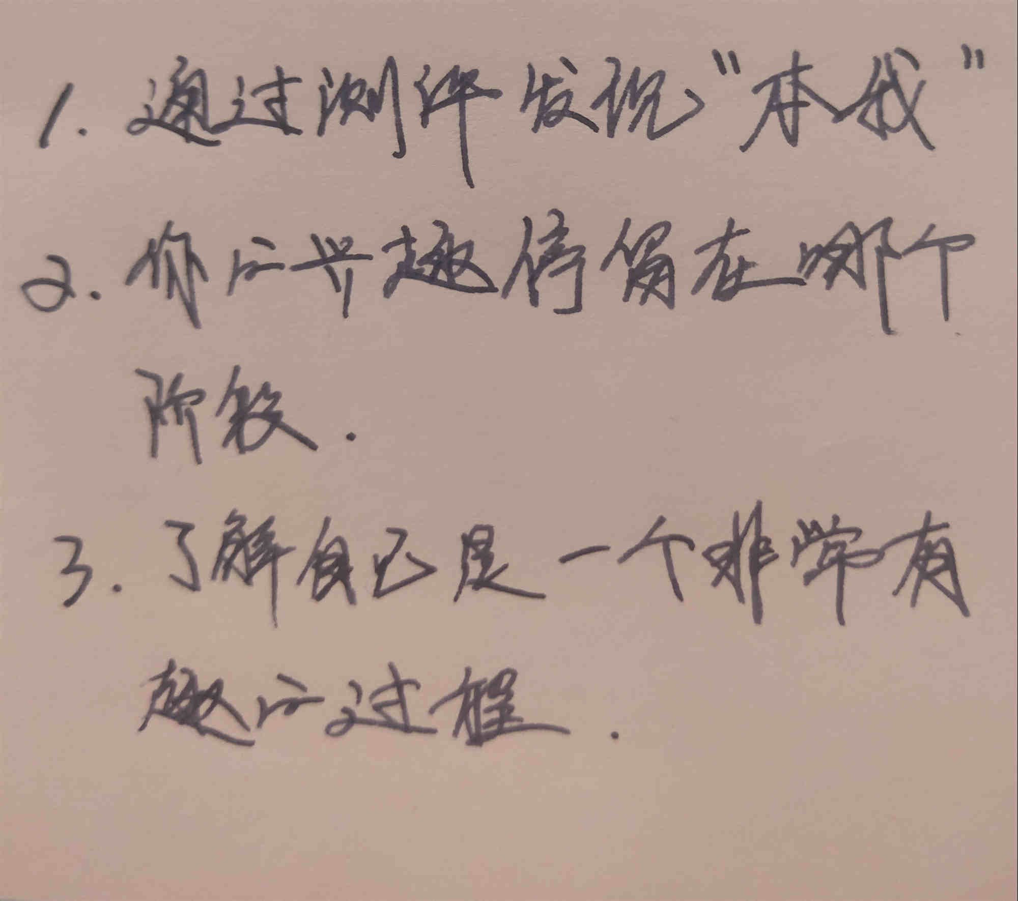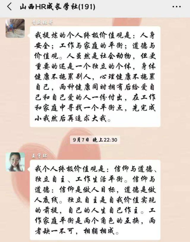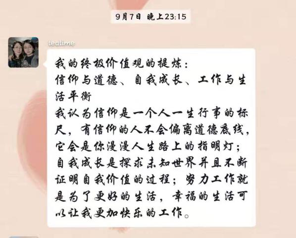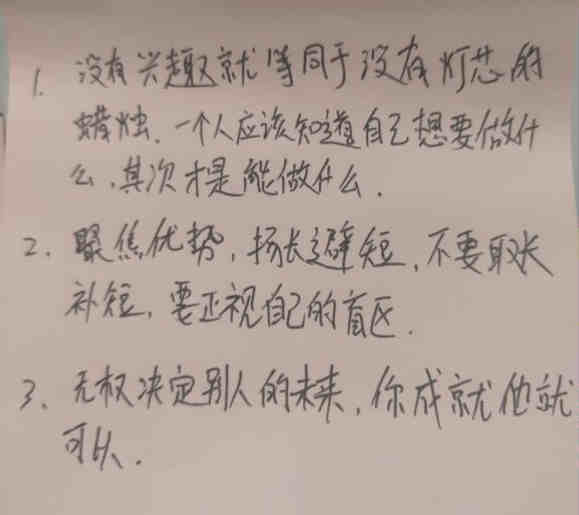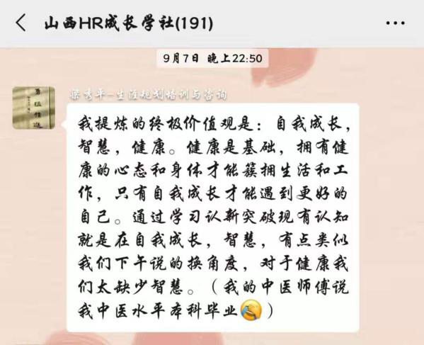 短暫的午間小憩后由明星學(xué)員杜春帶領(lǐng)著大家跳了一曲“蹦沙卡拉”,滿滿的激情與能量,各位學(xué)員再次滿血復(fù)活投入到了下午的課程當(dāng)中。性格、興趣、勝任能力都充分了解后,怎樣才能走向職業(yè)巔峰呢?緊接著又一波測試來襲——價值觀測試,36個價值觀重視程度的選擇,8個非常重視再次層層篩選,***后每位學(xué)員都得到了自己的3個******價值觀,果然一千個人心中會有一千個哈姆雷特,大家互相分享著自己的選擇,激烈的討論著自己的******價值觀,課后依然回味無窮。