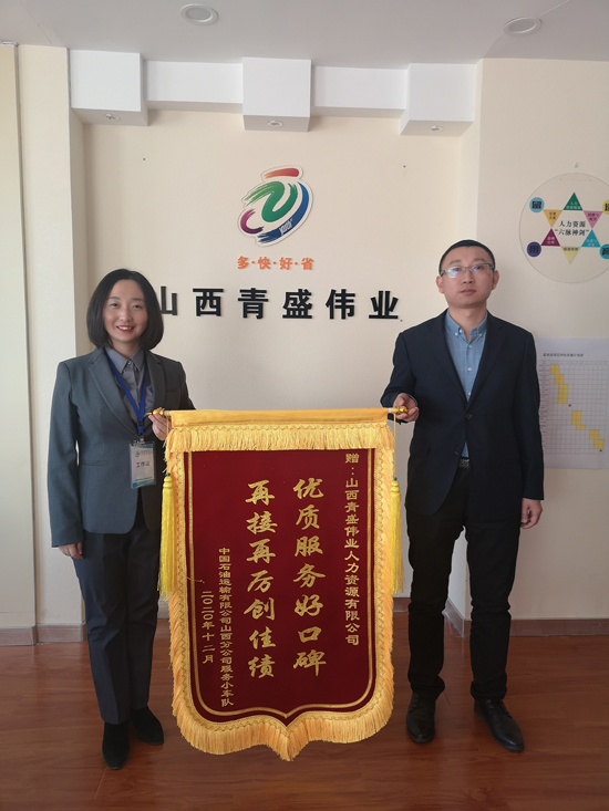 20201225日,山西青盛偉業(yè)人力資源有限公司收到了一份特殊的圣誕節(jié)禮物,中國石油運輸有限公司山西分公司服務小車隊負責人將一面寫著“優(yōu)質服務好口碑,再接再厲創(chuàng)佳績”的錦旗送到了我司。