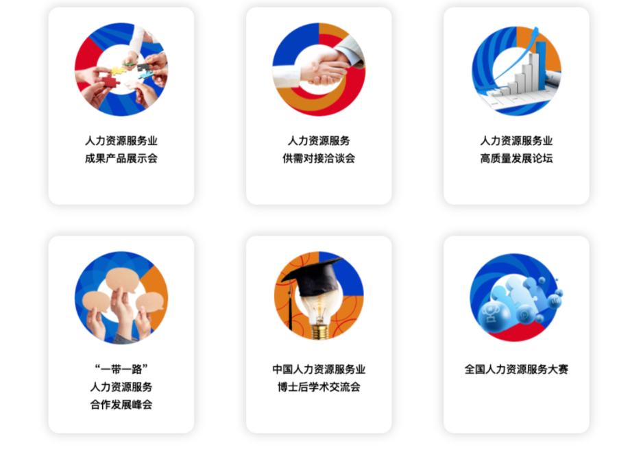 人力資源服務(wù)業(yè)成果產(chǎn)品展示會(huì)、人力資源服務(wù)供需對(duì)接洽談會(huì)、人力資源服務(wù)業(yè)高質(zhì)量發(fā)展論壇、“一帶一路”人力資源服務(wù)業(yè)合作發(fā)展峰會(huì)、中國(guó)人力資源服務(wù)業(yè)博士后學(xué)術(shù)交流會(huì)、全國(guó)人力資源服務(wù)大賽。