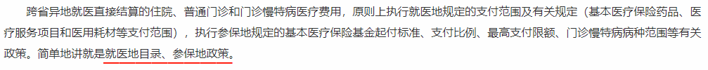 也就是說,費用能不能報,看就醫(yī)地的政策;能報銷多少,看參保地的政策。