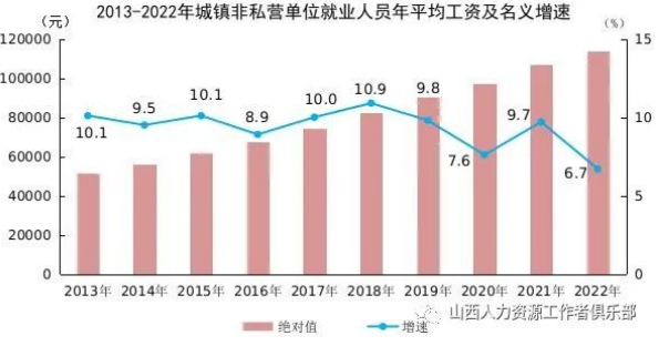2022年全國城鎮(zhèn)非私營單位就業(yè)人員年平均工資為114029元,比上年增加7192元,名義增長6.7%。扣除價格因素,2022年全國城鎮(zhèn)非私營單位就業(yè)人員年平均工資實際增長4.6%。