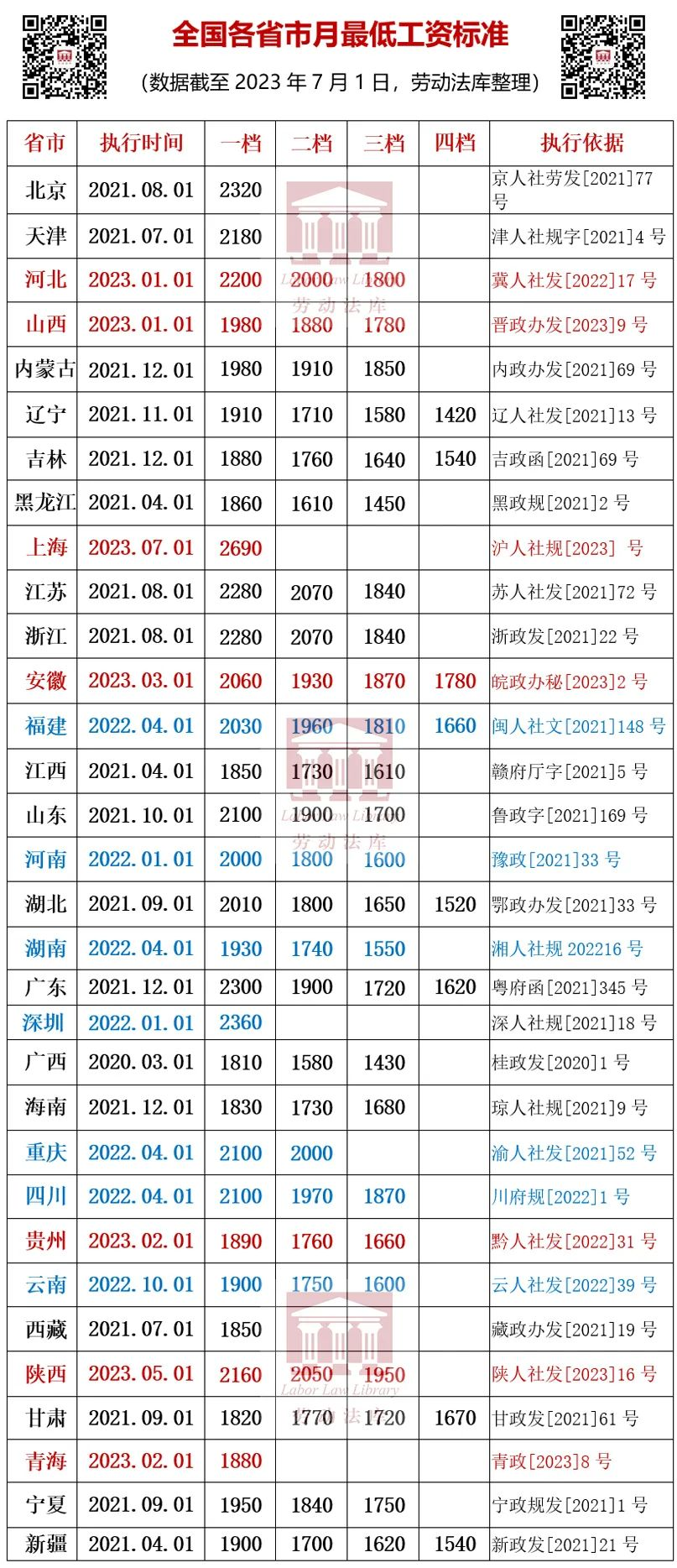 另外,河北、貴州兩省在2022年底先后發(fā)布通知,河北省從2023年1月1日起調(diào)整******工資標(biāo)準(zhǔn),月******工資標(biāo)準(zhǔn)三檔分別為2200 元、2000 元、1800 元。貴州省從2023年2月1日起調(diào)整******工資,一類地區(qū):每月1890元;二類地區(qū):每月1760元;三類地區(qū):每月1660元。