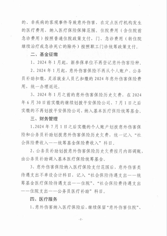 據(jù)介紹,意外傷害納入醫(yī)療保險后,繼續(xù)保留“意外傷害住院”“意外傷害轉(zhuǎn)外住院”“意外傷害急診住院”“意外傷害非急未轉(zhuǎn)住院”等醫(yī)療類別。意外傷害類結(jié)算參與累計起付線次數(shù)和基金支付限額,超出基本醫(yī)療保險支付限額的部分由大病補充保險按政策支付。