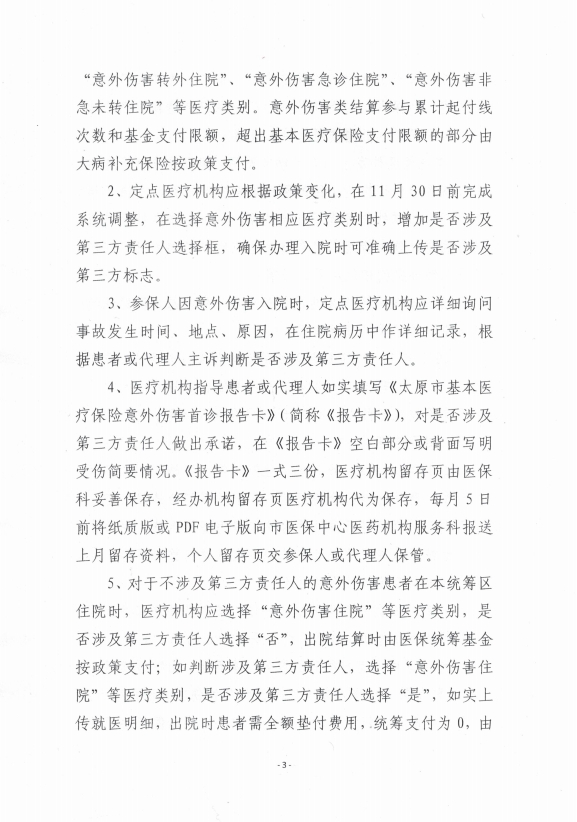 對于不涉及第三方責任人的意外傷害患者在本統(tǒng)籌區(qū)住院時,醫(yī)療機構應選擇“意外傷害住院”等醫(yī)療類別,是否涉及第三方責任人選擇“否”,出院結(jié)算時由醫(yī)保統(tǒng)籌基金按政策支付;