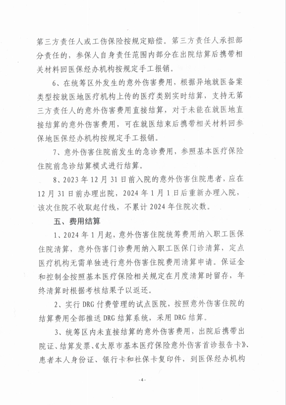 2023年12月31日前入院的意外傷害住院患者,應在12月31日前辦理出院,2024年1月1日后重新辦理入院,該次住院不收取起付線,不累計2024年住院次數(shù)。