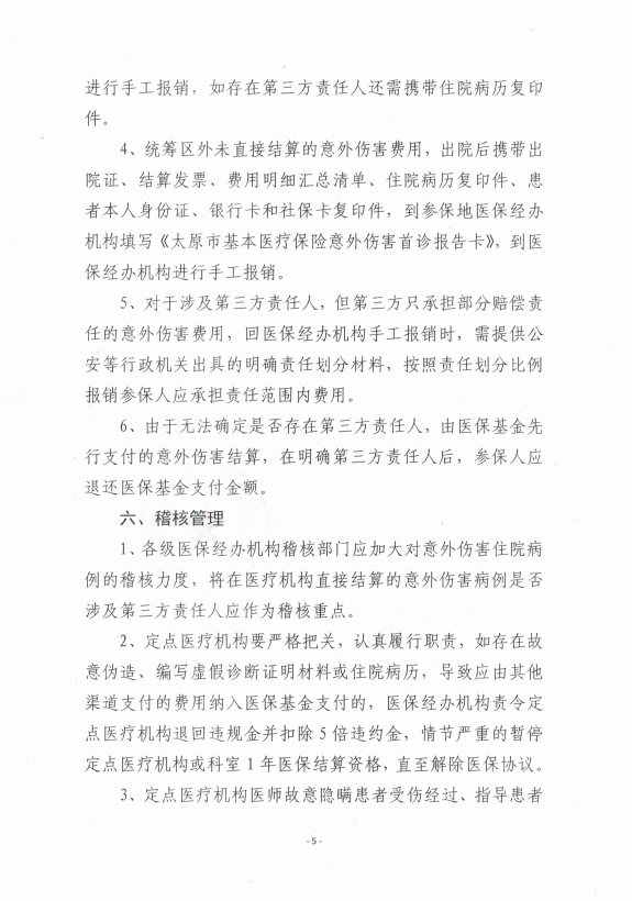 第三方責任人承擔部分責任的,參保人自身責任范圍內(nèi)部分在出院結(jié)算后攜帶相關材料回醫(yī)保經(jīng)辦機構按規(guī)定手工報銷。
