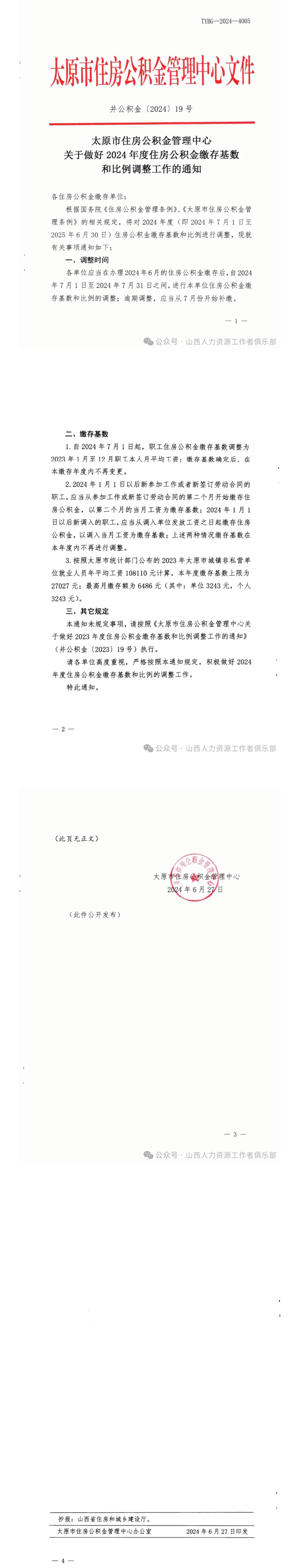 3.按照太原市統(tǒng)計部門公布的2023年太原市城鎮(zhèn)非私營單位就業(yè)人員年平均工資108110元計算,本年度繳存基數(shù)上限為27027元;******月繳存額為6486元(其中:單位3243元,個人3243 元)。
