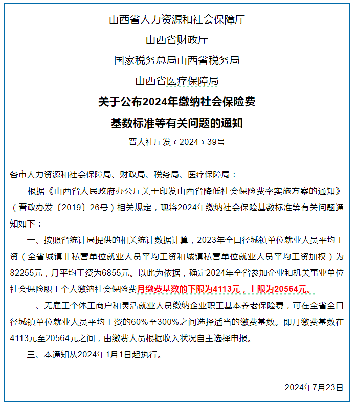 關于公布2024年繳納社會保險費基數(shù)標準等有關問題的通知